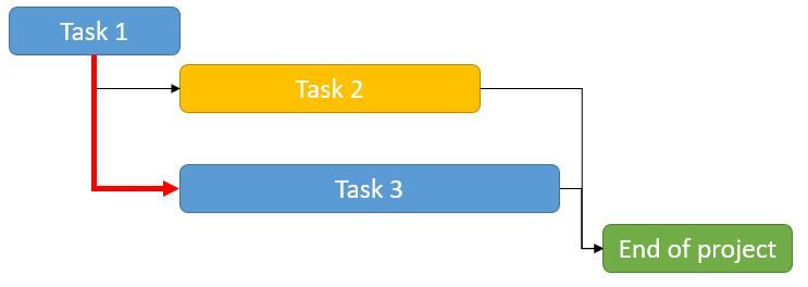 In the example below, the blue resource must perform tasks 1 and 3. However, these tasks are scheduled at the same time; the blue resource cannot therefore carry out the project as planned below: